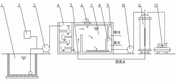 氣浮裝置的工作原理是在一定條件下,將大量空氣溶于水中,形成溶氣水,作為工作介質(zhì),通過釋放器驟然減壓,快速釋放,產(chǎn)生大量微細氣泡粘附于經(jīng)過混凝反應(yīng)后廢水中的“礬花”上,使絮體上浮,同時用刮渣機刮除,從而迅速地除去水中的污染物質(zhì),達到凈水的目的。 產(chǎn)品特點 1、裝置廣泛應(yīng)用于造紙、印染、制革、電鍍、紡織、石油、化工、食品等相對領(lǐng)域; 2、在給排水處理工藝中對固液、液液和比重近于水的微小懸浮物的進行去除; 3、占地面積小,單位面積產(chǎn)水量高,渣體含水率低; 4、溶入的氣體經(jīng)驟然減壓釋放,產(chǎn)生的氣泡不僅微細、粒度均勻,密度大,而且上浮穩(wěn)定,對液體擾動微小,特別適用于對疏松絮凝體、細小顆粒的固液分離; 5、加壓條件下,空氣溶解度大,供氣浮用的氣泡數(shù)量多,能夠確保氣浮效果; 6、部分回流式處理效果顯著、穩(wěn)定、并能較大的節(jié)約能耗; 7、工藝過程及設(shè)備簡單、造價低、便于管理和維護; 8、設(shè)備調(diào)試后,正常運行可達到自動化無人管理狀態(tài)。 適用范圍 1、電鍍廢水重金屬離子,如鉻、鋅、銅、鎳、鉛等總含量在50ppm以下,去除率均70%以上; 2、印染廢水的色度去除達90%左右,COD去除率達60~70%左右,BOD去除率達50%左右; 3、食品屠宰和制革廢水的COD去除率達70%左右,懸浮固體去除率達90%左右; 4、煉油廢水的油脂,可降到10mg/L以下,廢水能達到澄清程度; 5、對化工廢水和顏料油漆等,COD去除率達74%,色度去除率達93%左右; 6、造紙白水的纖維回收率可達95%左右,COD去除率達86.7%左右,清水完全回用; 7、大池沐浴水濁度可穩(wěn)定在10℃以下,水中的細菌有較大幅度下降; 8、生活飲用水及工業(yè)的濁度可凈化的5℃以下,同時對色度耗氧量降低有良好的效果。 工藝說明 本設(shè)備的工作方法屬于加壓溶氣氣浮法,其工作原理:在一定條件下,將大量的空氣溶于水,形成溶氣水,作為工作介質(zhì),通過釋放驟然減壓,快速釋放,產(chǎn)生大量的微細氣泡,粘附于經(jīng)過混凝反應(yīng)后的廢水中的"礬花"上,使絮體上浮進行清除。 1. 調(diào)節(jié)池 2. 投凝劑設(shè)備 3. 污水泵 4. 折板聚凝池 5. 釋放器 6. 刮渣機 7. 氣浮池 8. 溶氣水存放池 9. 污泥池 10. 溶氣水泵 11. 溶氣罐 12. 空壓機