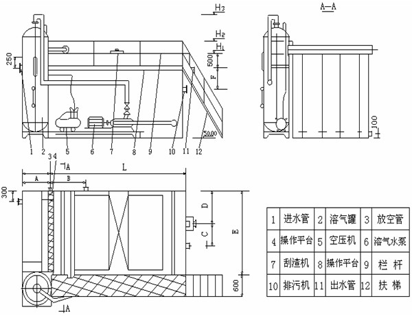 設(shè)備結(jié)構(gòu) YF一元化氣浮裝置有五個部分:加藥絮凝部分、回流水溶氣釋放部分、氣浮部分、刮渣部分、電氣控制部分。 |