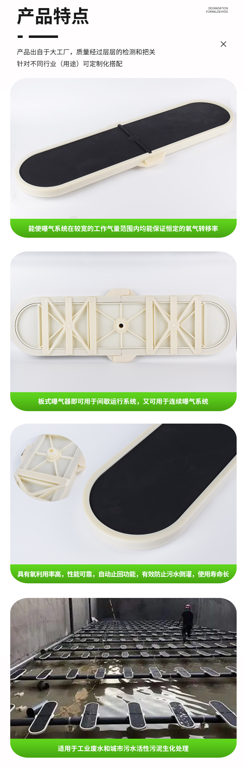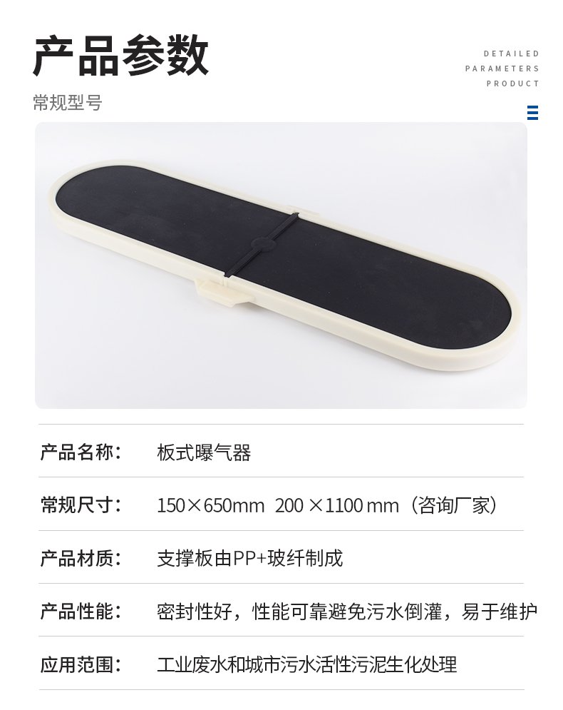 板式曝氣器設計結構使曝氣器系統(tǒng)在較寬的工作氣量范圍內保持低能耗、高效率;開孔方式,在鼓風機工作的過程中,曝氣器產生的氣泡均勻,達到很好的蓮花效應;該曝氣即可用于間歇運行系統(tǒng),又可用于連續(xù)曝氣系統(tǒng),具有氧利用率高,性能可靠,曝氣器具有自動止回功能,有效防止污水倒灌,使用壽命長等特點。
