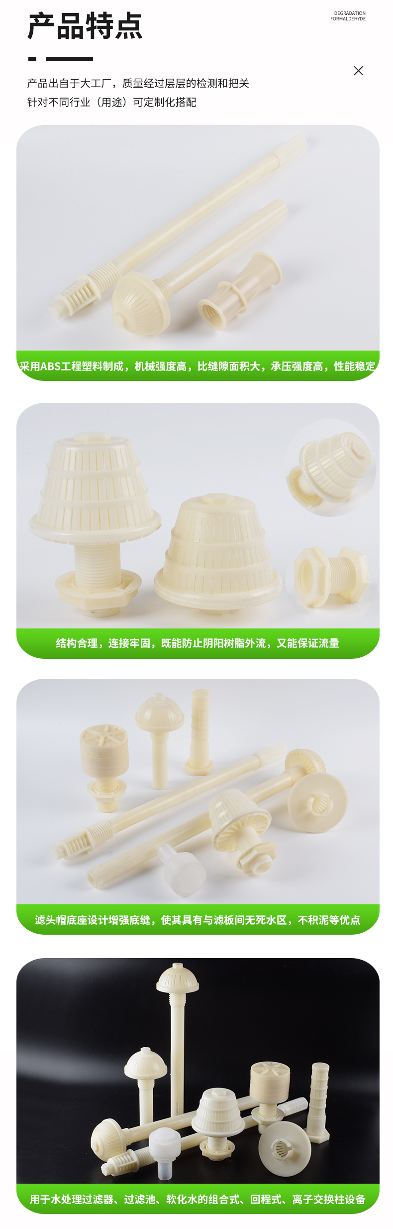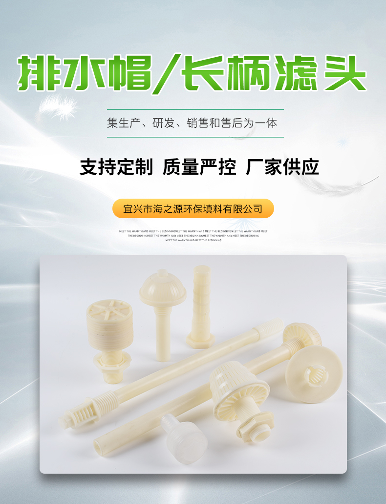 濾頭又叫濾帽,用在濾池配水系統(tǒng)和過濾器中。反沖洗濾頭包括排水帽、濾水帽兩種,均采用ABS工程塑料制成,結(jié)構(gòu)合理,連接牢固,承壓強度高,縫隙不變型,使用效果好,既能防止陰陽樹脂外流,又能保證流量。適用于濾池汽水反沖洗系統(tǒng)和軟化水質(zhì)組合式,壓力式,回程式及離子交換器等水處理設(shè)備的過濾裝置。